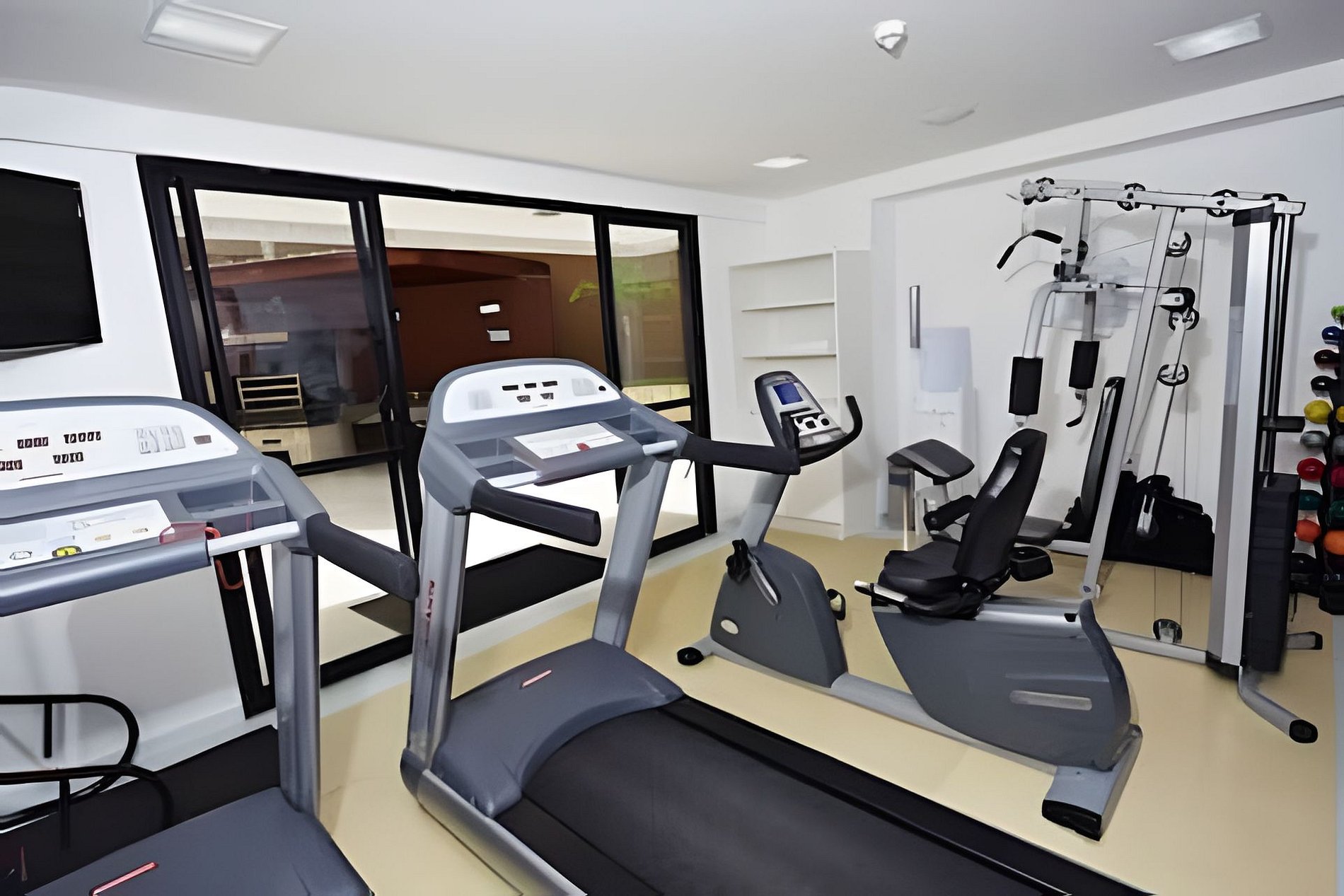No hotel, tem academia, pisciana com cadeiras de sol e mesa, restaurante e sauna.